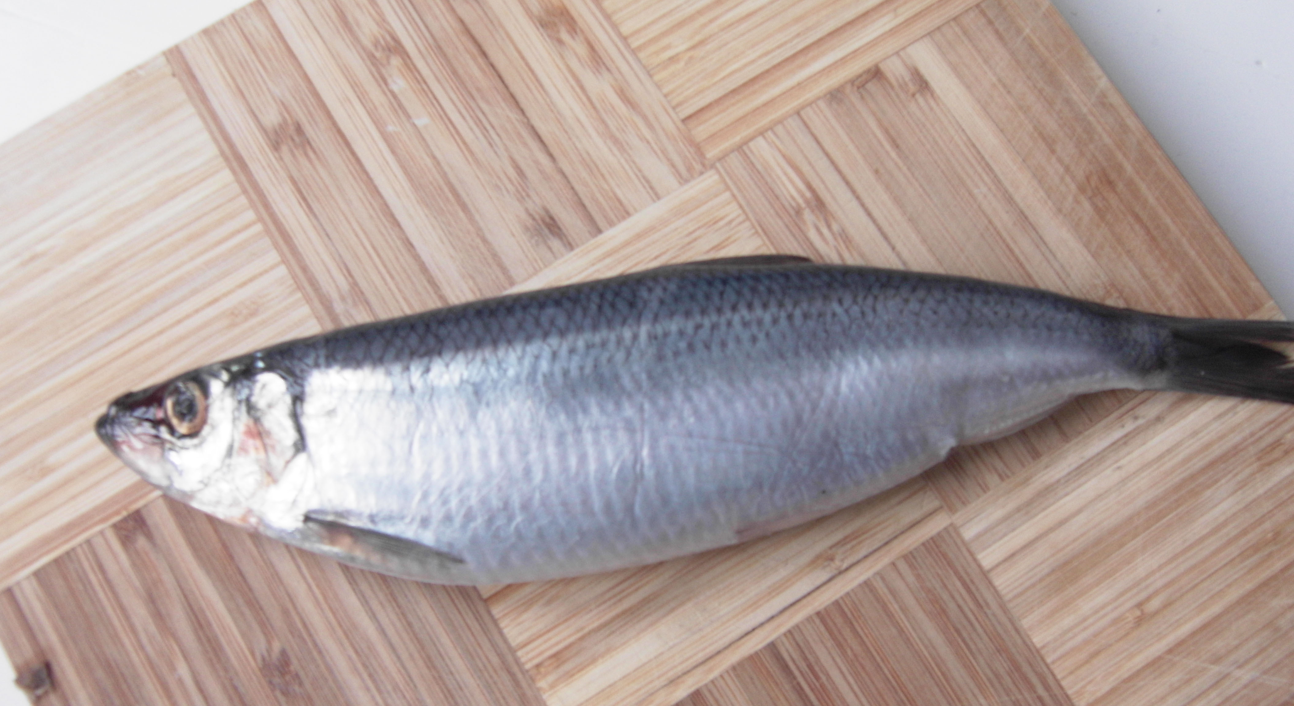 You need a herring for each person. Gut and fillet the herring and slice across the skin with a sharp knife (so that when you fry it, it doesn’t curl), then season the fillets and set aside.