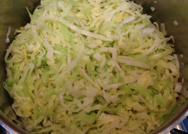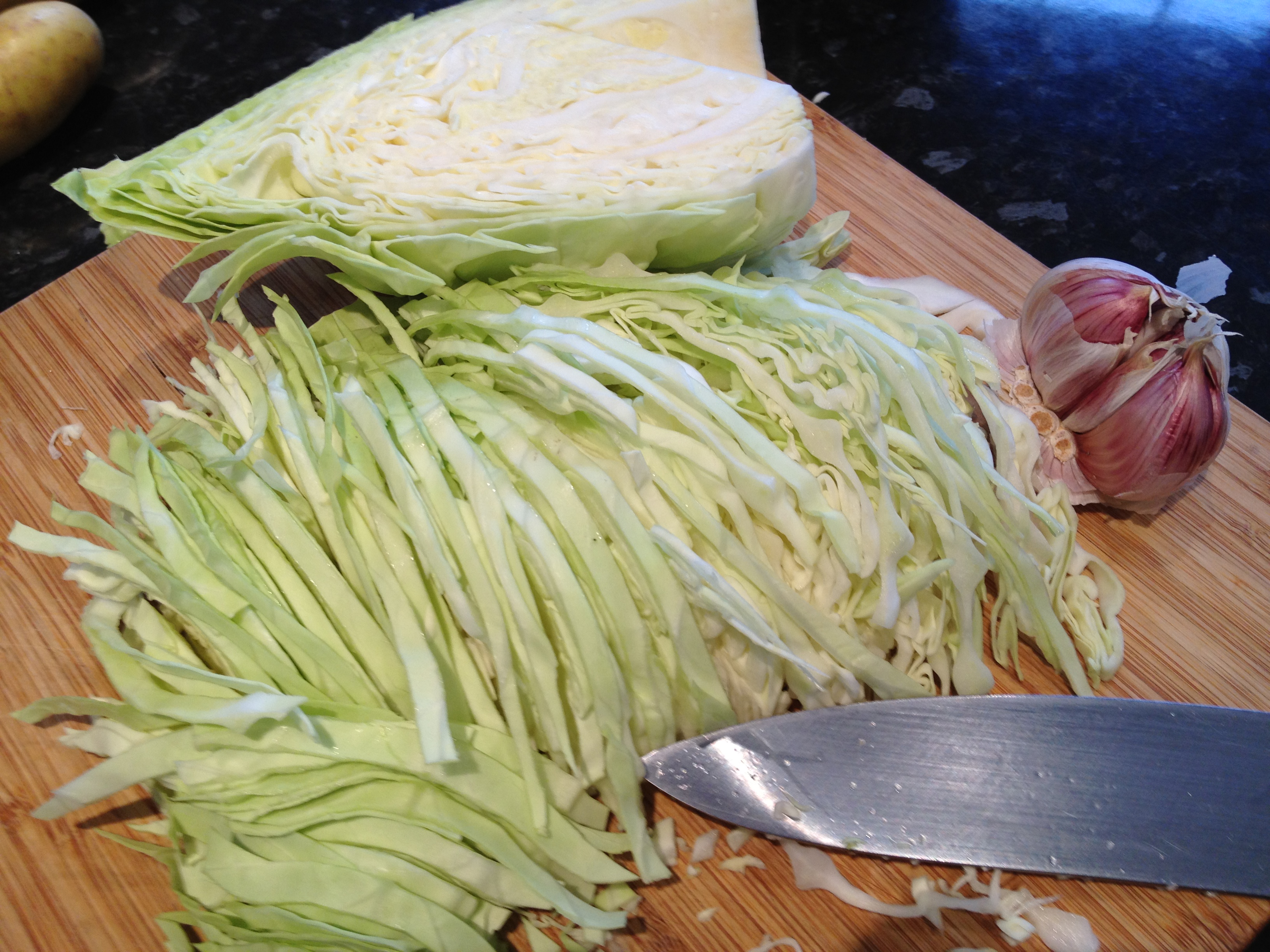 As above, finely chop a spring cabbage and put it into a large saucepan of salted boiling water. Leave it for no more than 2 minutes and then drain it in a sieve and put it back into the saucepan with fresh cold water. drain again and put back into the pan again with freash cold water, so that the cabbage stops cooking completely.