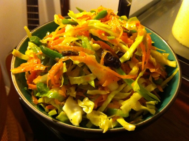 This is so easy. all you have to do is finely chop a spring cabbage (see pic above), a fresh red chilli (with the seeds removed) and few spring onions along with a few grated carrots and a handful of raisins. You can also throw in a few cashews if you like. Now you have a choice: You can either go East by adding sesame oil, soy sauce and a little rice vinegar, or you can stay in Europe and go with olive oil, red wine vinegar and plenty of salt and pepper. Either way it’s fantastic with chicken, lamb and pork, and works really well in a wrap with any of the above.