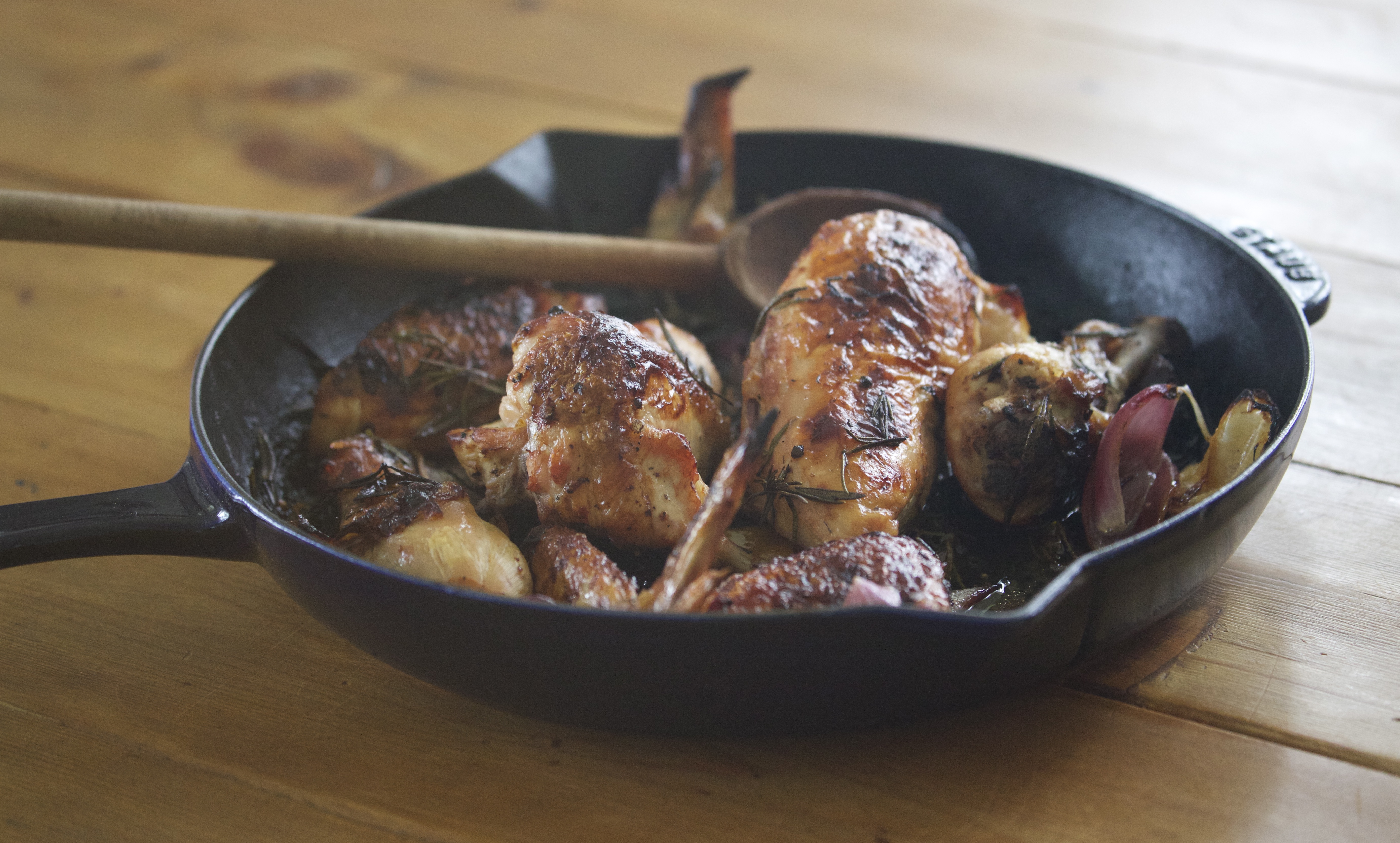 Now take the pieces and put them in a large roasting tin with a quartered onion, a bulb of garlic roughly crushed, a quartered lemon and lots of salt, pepper, olive oil and white wine. Roast it in an oven at 220c for about 40 mins, turning twice throughout, but making sure you finish cooking with the skin side up so that it gets nice and crispy. Perfect with mashed spuds and some green stuff.