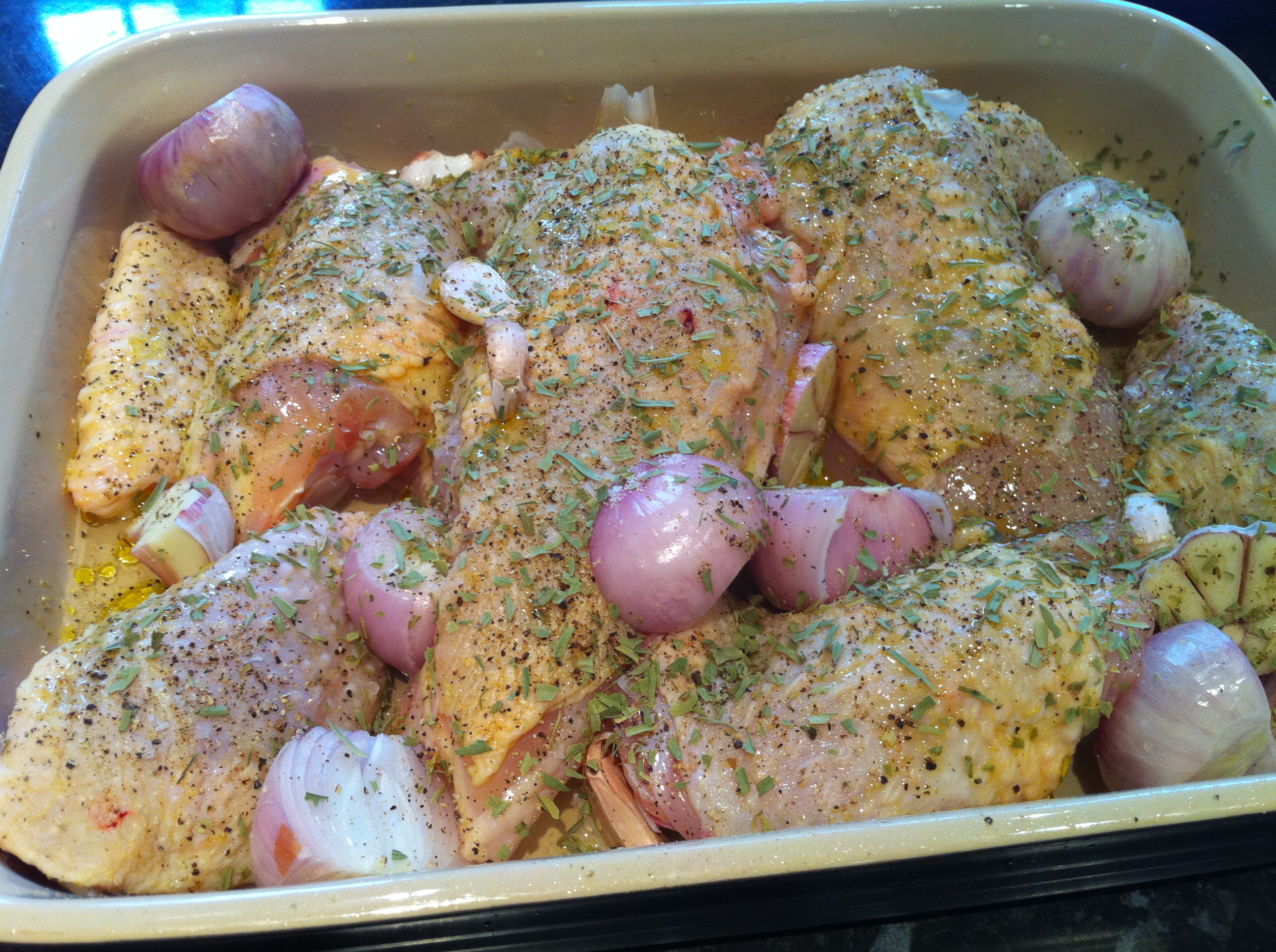 In the meantime, take your biggest casserole dish and fry a couple of onions, at least 10 cloves of garlic and two thumbs of ginger, all finely chopped (actually, one of the onions I like to chop into slices so that you can see them in the dish). Throw in a few red and green chillies – as many as you can handle (you have to decide this one for yourself) and fry for a few minutes. Next add four roughly sliced chicken breasts and fry them in the same pan until brown but not fully cooked. Now add the spices. I would use at least the following: 5 cardamom pods, a tablespoon of each of coriander seeds, fennel seeds, cumin seeds, black peppercorns, sea salt and star anise. Grind them, heat them in a dry frying pan until they almost start to smoke in the heat and then throw into the casserole along with a whole cinnamon stick and a bay leaf.