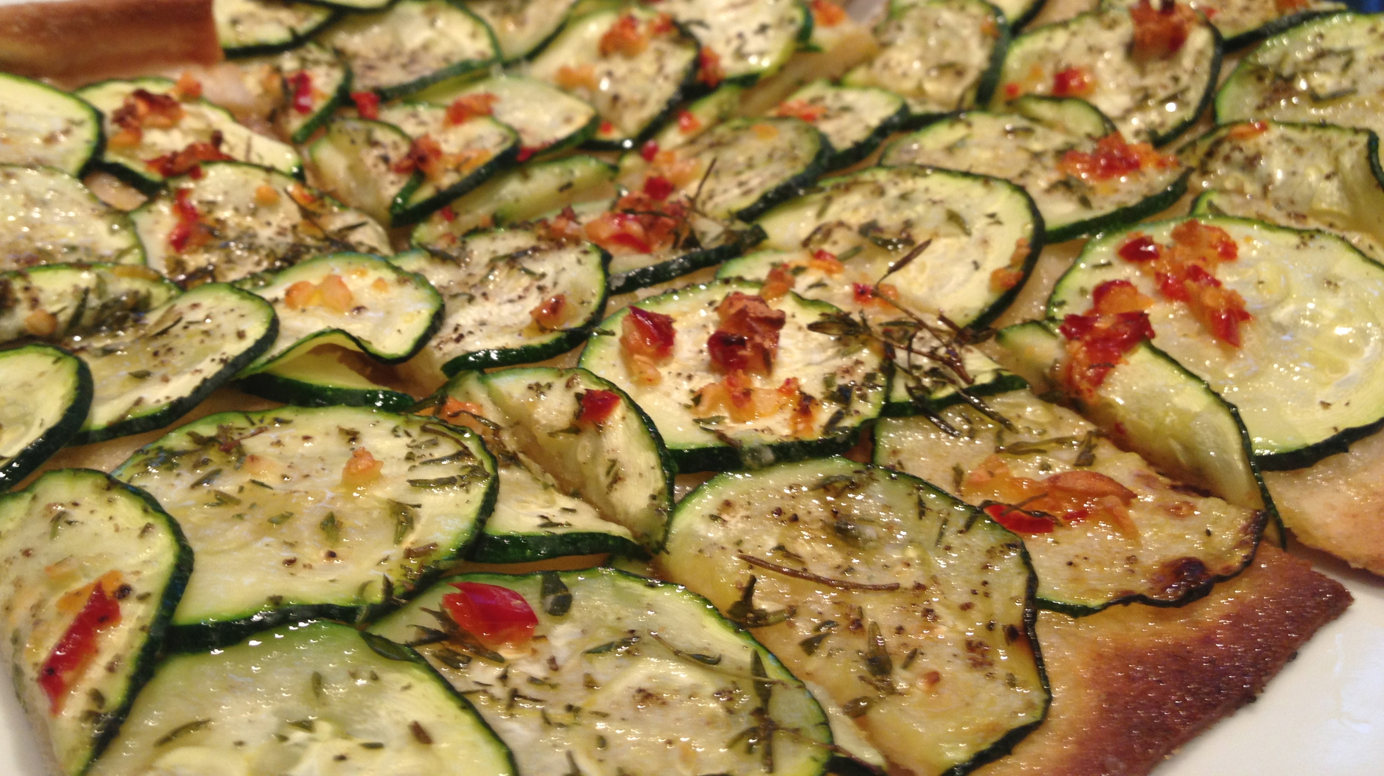 So simple. Use a standard pizza base and roll it very thin (with semolina for extra crispiness). Then lay thinly sliced courgettes across the whole base slightly overlapping, along with whatever herbs you like (I’d go for thyme, finely chopped). generously season and give it some good olive oil action. For extra excitement you could add a little finely chopped red chilli and garlic. Cook in the hottest possible oven for about 10 mins.